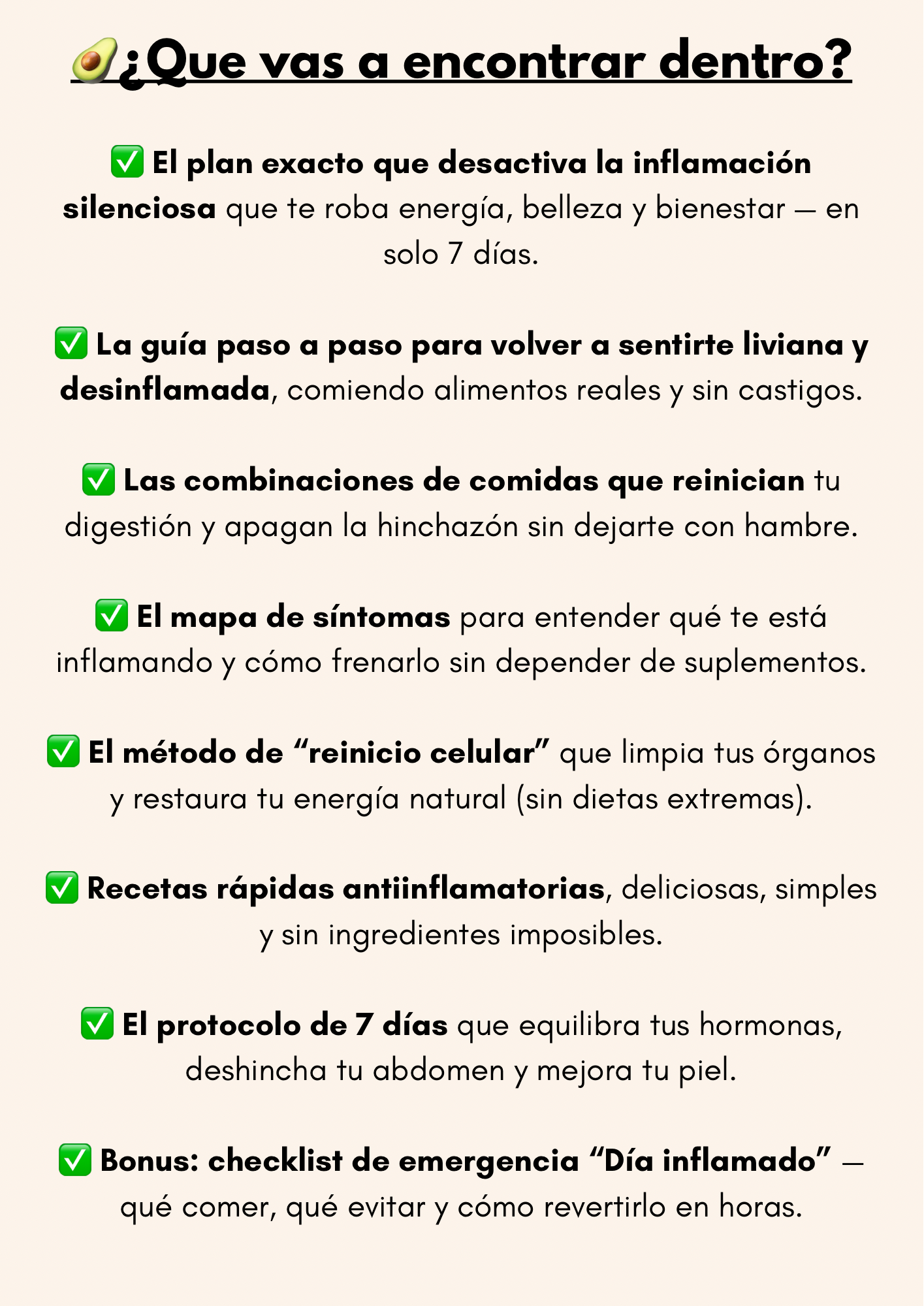 Vas a recibir una guía completa con recetas 100 % saludables, antiinflamatorias y sin ultraprocesados. Incluye desayunos, almuerzos, meriendas y cenas pensadas para mejorar la digestión, la energía y el bienestar general.